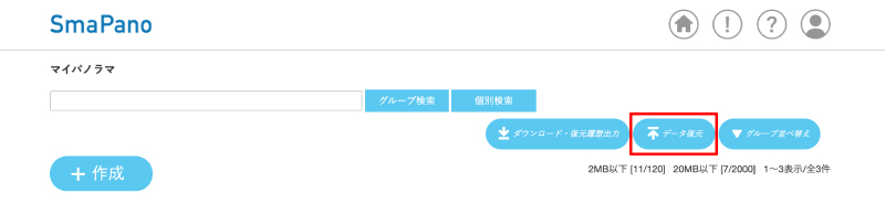 マイパノラマ画面から360度バーチャルツアー(グループ内のすべてのパノラマ画像)を削除した場合でも、ダウンロードしたツアーデータを「データ復元」機能でマイパノラマ画面にアップロードし、再び編集することができます。