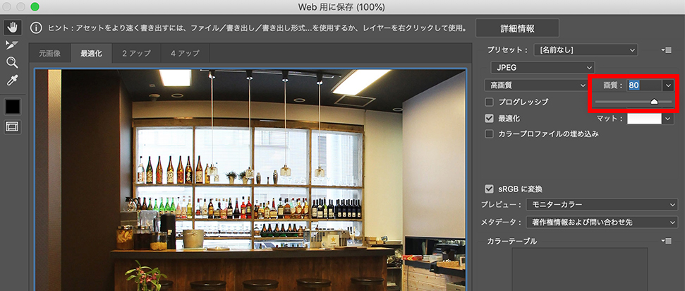 2. Web用に保存画面にて、右上にある「画質」の値を下げます。