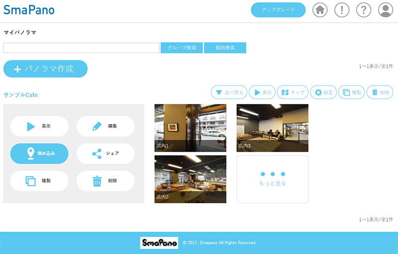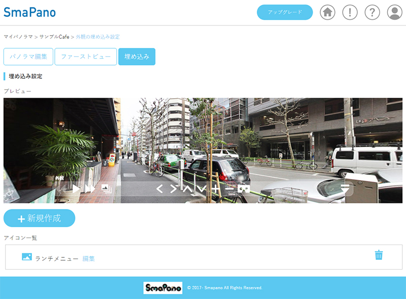 マイパノラマ画面に戻り、パノラマ画像のサムネイルにカーソルを合わせると、編集項目の表示に切り替わります。「埋め込み」ボタンをクリックして編集を始めます。