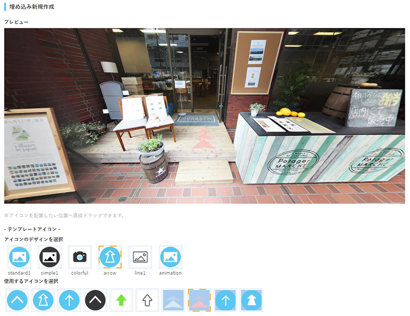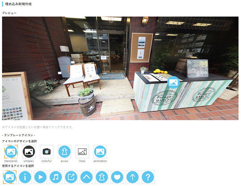 アイコンを選択したら、パノラマ上のアイコンをドラッグして、設置したい場所へ移動させます。アイコンは自由に選択できます。