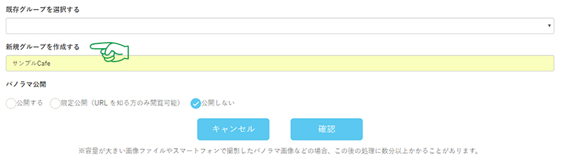 なお2枚目以降のパノラマ画像をアップロードする際、既存のグループ名から先ほど新規に作成したグループ名を選択します。
