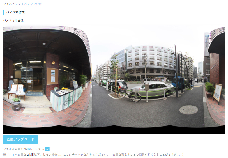 「画像アップロード」ボタンをクリックして、パノラマ画像のアップロードをします(無料ユーザーの場合、パノラマ画像は2MB以下パノラマと20MB以下のパノラマ一つずつまでしかアップロードできません。)。