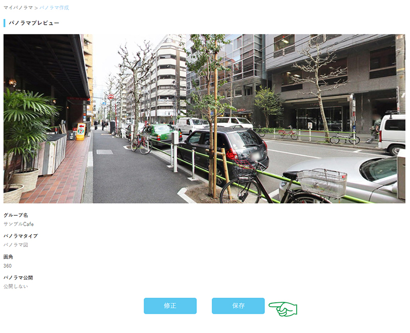 パノラマ公開を選択し、「確認」ボタンをクリックすると確認画面になります。