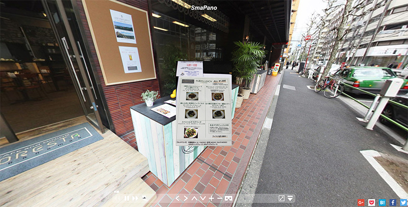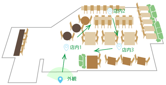 このサンプルツアーは、カフェの4か所のポイントで撮影したパノラマ画像を使用し、「外観を起点に店内1→店内2→店内3→外観へ戻る」構成です。