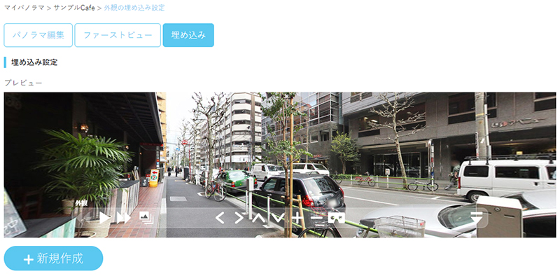「埋め込み」ボタンをクリックすると、パノラマ画像に設置済みのアイコン情報が表示されます。「+新規作成」をクリックして、「つなげる」設定をスタートしましょう。