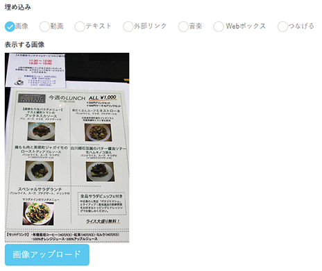 埋め込みの種類で「画像」を選択し、表示したい画像をアップロードします。