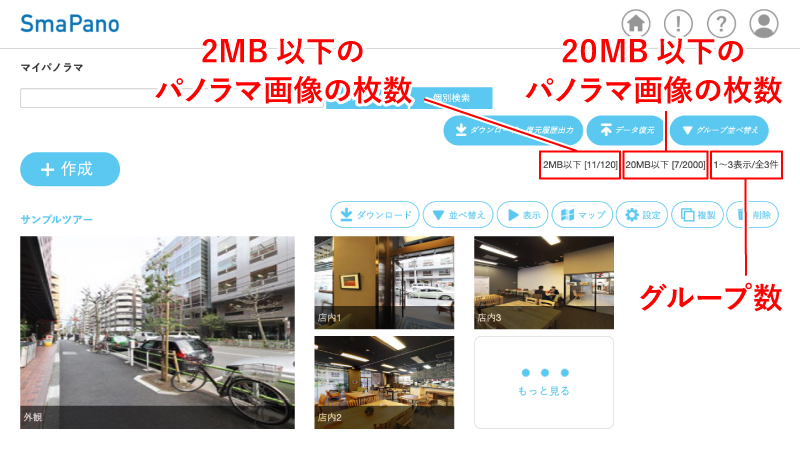 「2MB以下/20MB以下」パノラマ画像のアップロード枚数は、SmaPanoのマイパノラマ画面、右上で確認することができます。