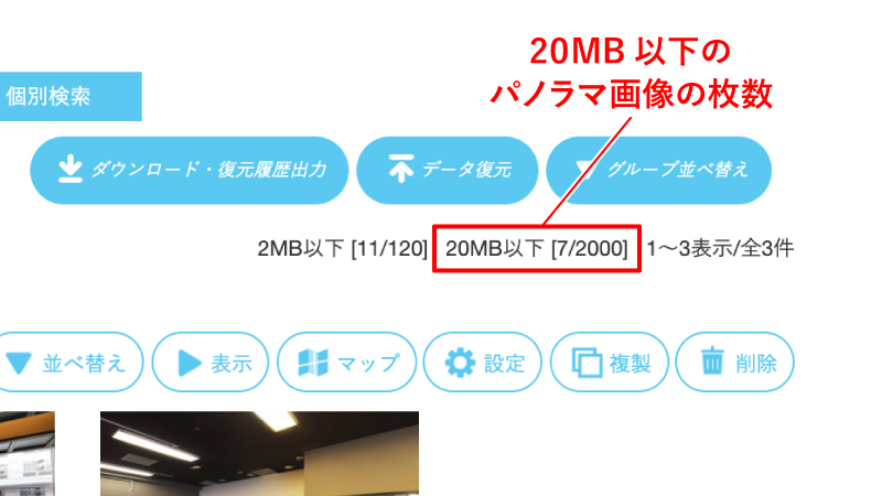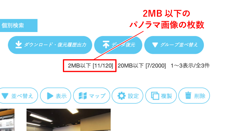 2MB以下のパノラマ画像(パノラマ図・平面図)のアップロード枚数を確認するには