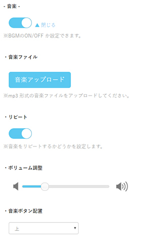 2017年9月20日 各種機能説明 / 埋め込み 音楽ファイルの設定 投稿者: admin 「埋め込み」をした「音楽ファイル」の詳細設定ができます。 ▼BGMのON/OFF ▼音楽ファイルのアップロード ▼音楽のリピートON/OFF ▼ボリューム調整 ▼音楽ボタンの配置