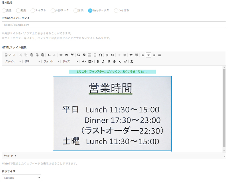 SmaPanoでは360度パノラマ画像上に「Webボックス」を埋め込み、ボックス内をHTMLで作成・編集することができます。