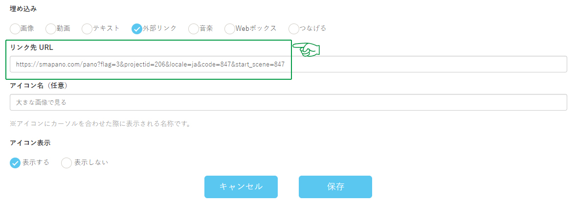 「外部リンク」にチェックを入れ、拡大表示をするページのアドレスをペーストします。