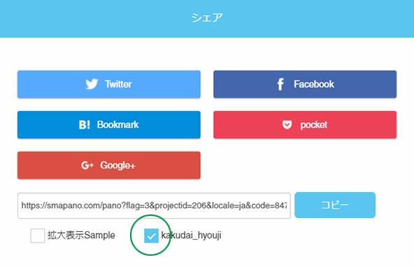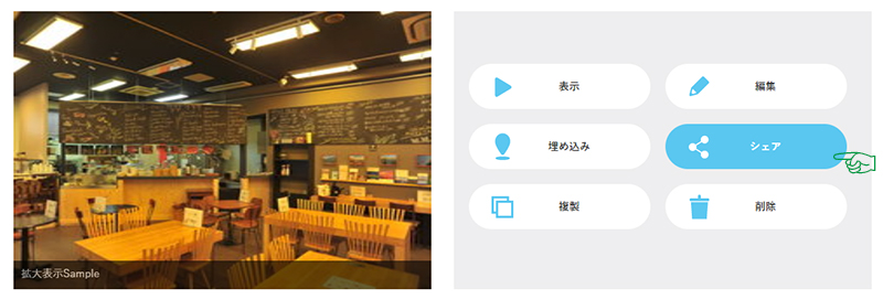▼ホーム画面の拡大表示させる画面のサムネイルにカーソルを乗せると、編集ボタンが表示されます。「シェア」をクリックして、拡大表示するページのみにチェックを入れ、アドレスをコピーボタンで取得します。