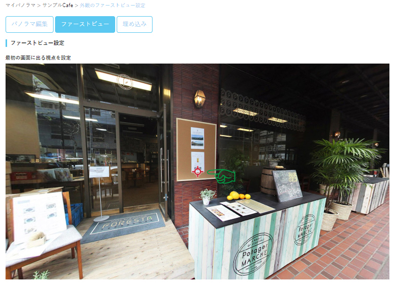 ▼画面上にある赤いマーカーが、ファーストビュー(最初に見えるところ)の中心です。見え方を設定できるので、よりイメージに合う視点になるよう調整してみましょう。